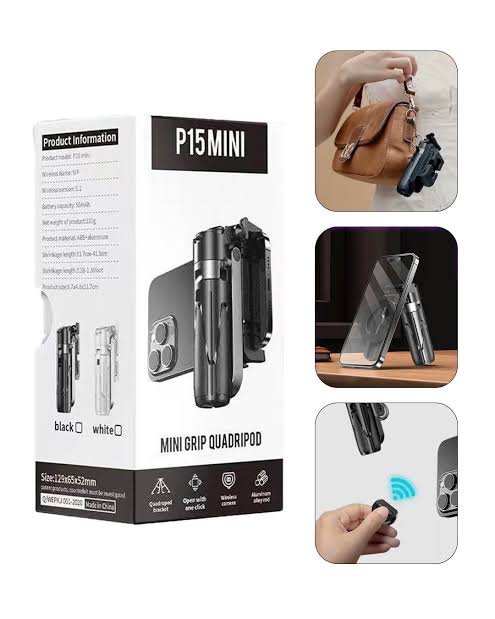 **حامل هاتف P15 Mini** حامل عملي صغير الحجم يجمع بين قبضة يد وحامل رباعي، يمنحك ثباتًا مثاليًا لتصوير الصور والفيديوهات والبث المباشر. سهل الحمل، متوافق مع أغلب الهواتف، ومثالي لصناع المحتوى والاستخدام اليومي. 📱📸